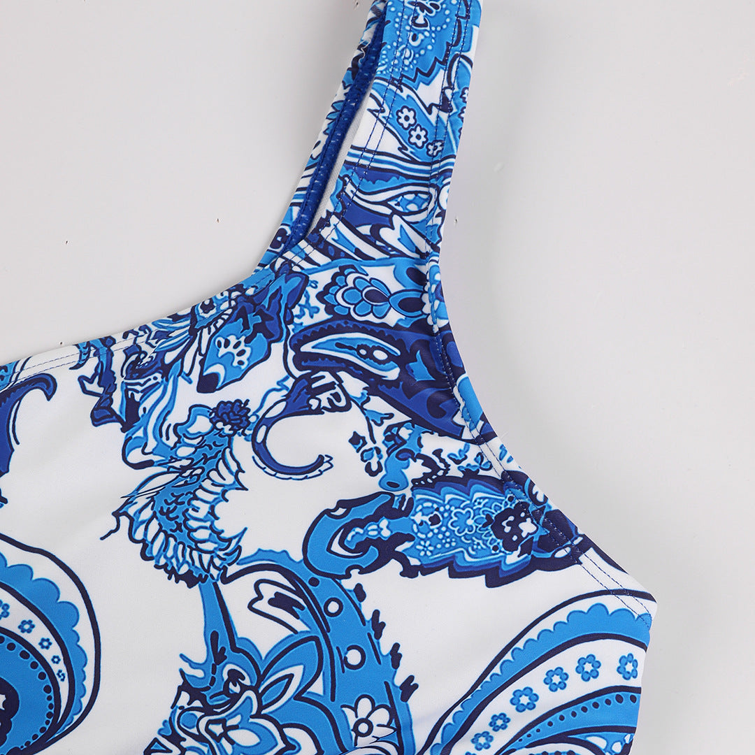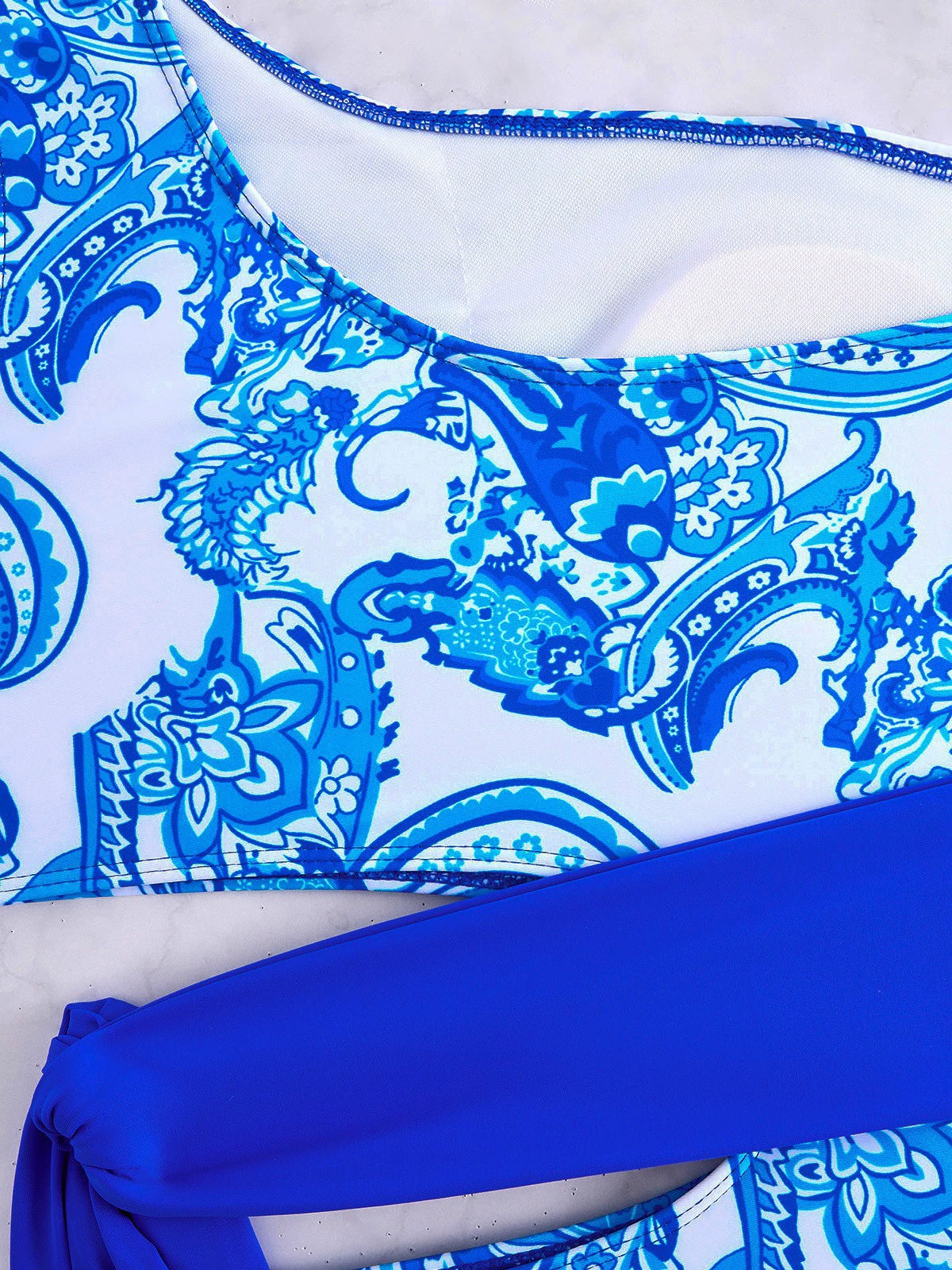 Blue Paisley One-Shoulder Cutout Swimsuit with Waist Tie