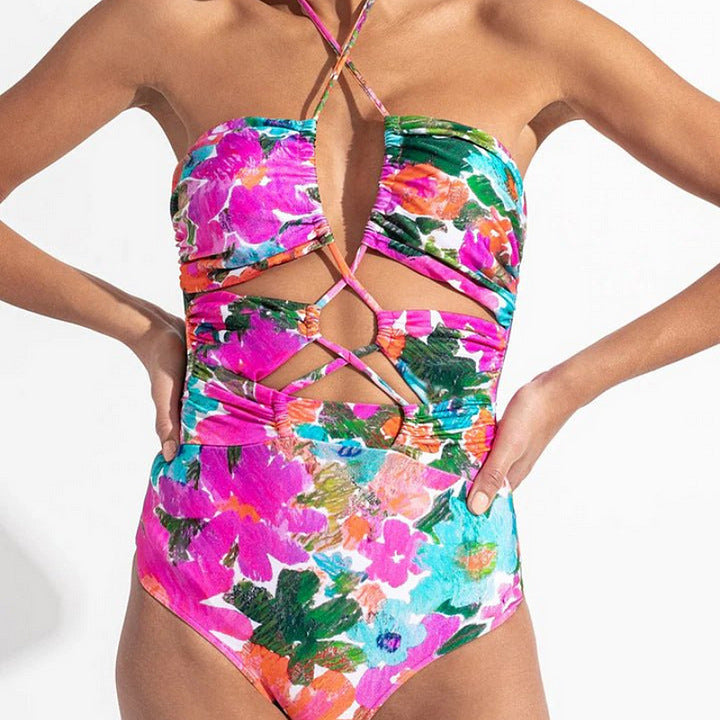 Tropical Floral Cut-Out One-Piece Swimsuit with Criss-Cross Detail | Women’s Designer Swimwear