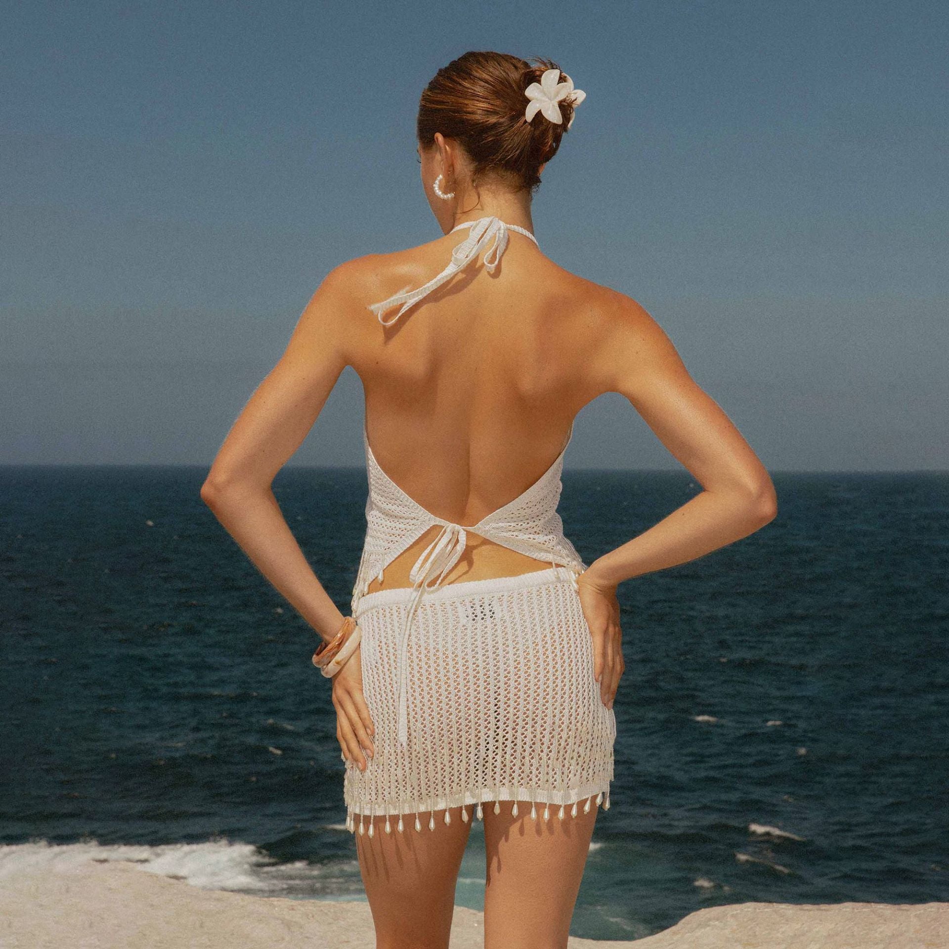 White Crochet Halter Top & Mini Skirt with Tassel Hem